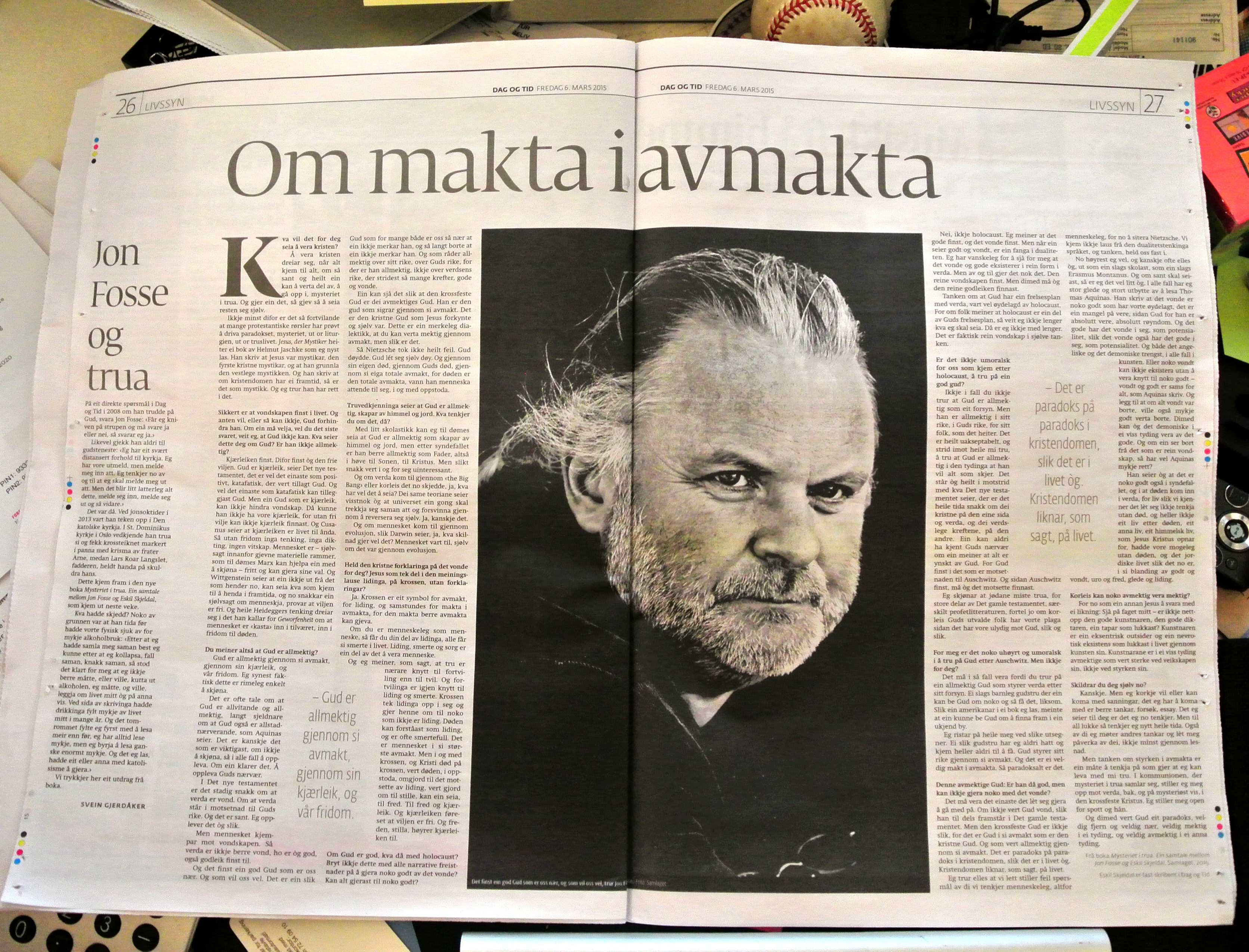 «Det må vera det einaste det lét seg gjera å gå med på. Om ikkje vert Gud vond, slik han til dels framstår i det gamle testamentet. Men den krossfeste Gud er ikkje slik, for det er Gud i si avmakt som er den kristne Gud. Og som vert allmektig gjennom si avmakt. Det er paradoks på paradoks i kristendomen, slik det er i livet òg. Kristendomen linar som sagt på livet.»