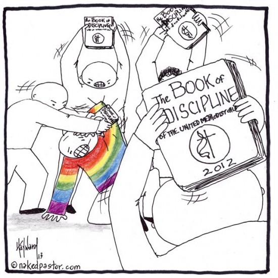 (Tegningen som innleder bloggen laget bloggeren «nakedpastor» (anbefales) etter henvendelse fra en pastor i United Methodist church etter Generalkonferansen i 2012)