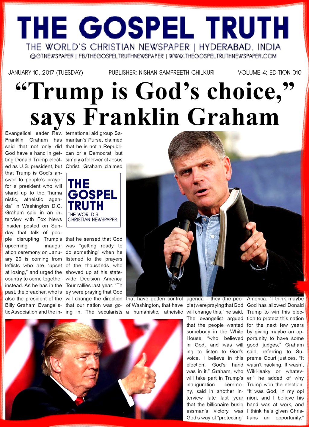 4) Kan Metodistkirken i Norge leve med at kirken indirekte ( gjennom to pastorers engasjement) kan bli oppfattet og beskyldt for å stille seg seg bak en «evangelist» som hyller president Donald Trump som valgt av Gud og utpekt til en ny Moses; som fraskriver tidligere president Obama kristentroen; som hevder at han ikke så en eneste kristen på metodisten Hilary Clintons valgkampteam, og som ikke minst hetser/fordømmer både homofile og islam?