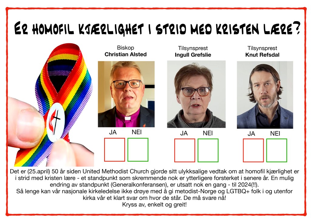 Tiden er overmoden for at vår nasjonale kirkeledelse (biskop og tilsynsprester) offentlig klargjør hvor de står i homofilispørsmålet. Det kan gjøres så enkelt som å svare «JA» eller «Nei» i kommentarfeltet under dette bildet på absoluttMetodists Facebookside: