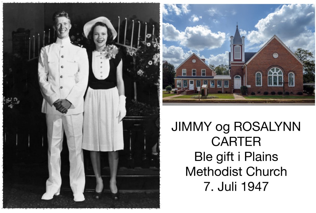 Jimmy Carter og Rosalynn Smith vokste opp nær hverandre «på landsbygda» i Georgia. Hjembyen deres Plains har, uten tilreisende besøkende, knapt 600 innbyggere og hadde / har 11 kirker! Rosalynn var metodist, men ble baptist da hun giftet seg med tredjegenerasjons sørstatsbaptisten Jimmy straks etter han var ferdig utdannet ved the Naval Academy. Bryllupet ble holdt i Plains Methodist Church 7. juli 1947.