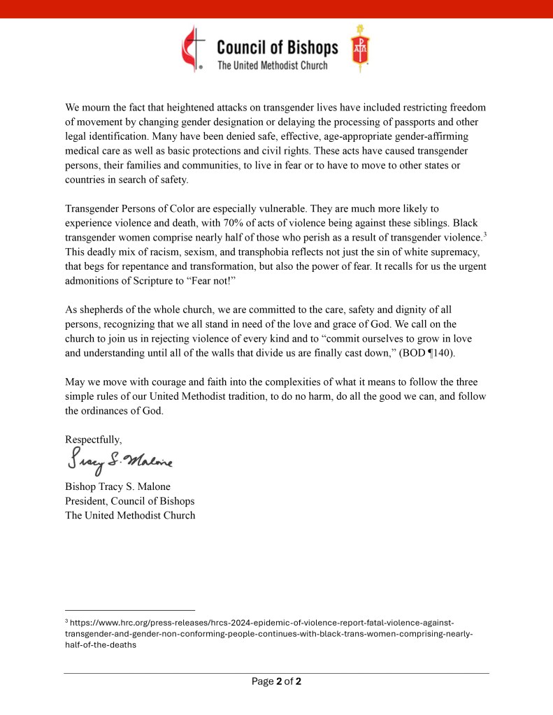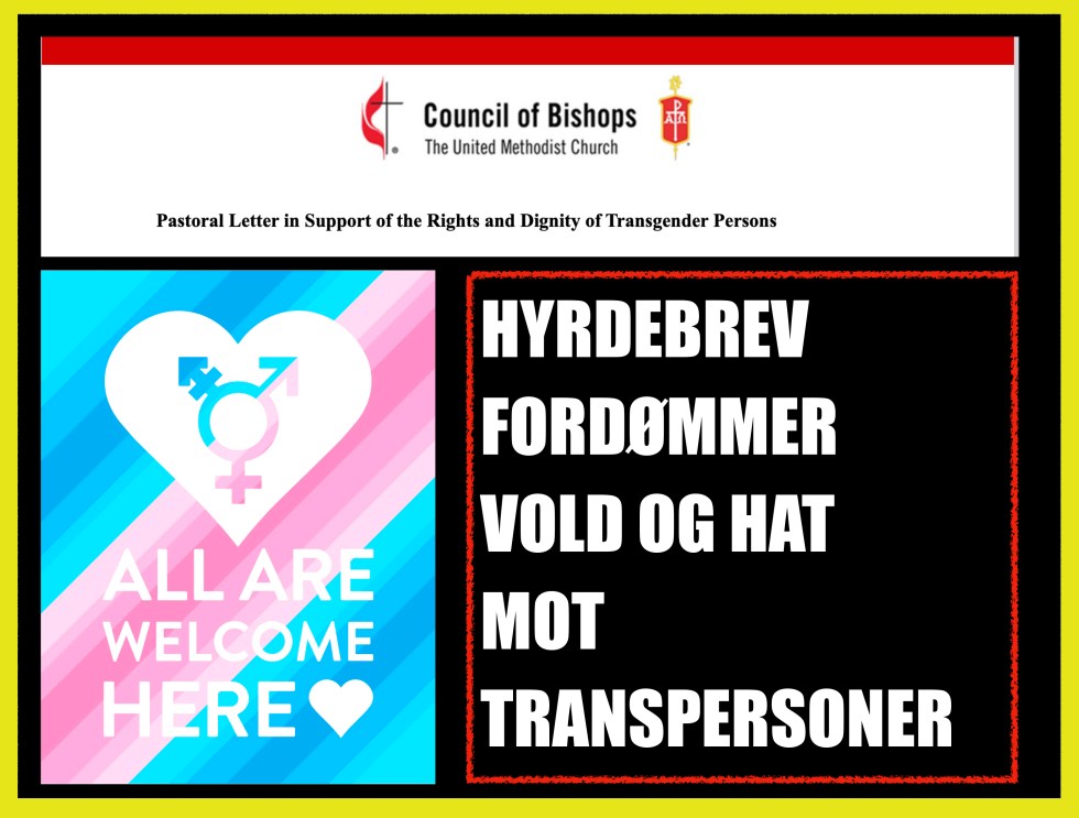 Metodistkirkens biskoper oppfordrer i et hyrdebrev alle United Methodists til å avvise og bekjempe volden som omgir livene til transpersoner, og fordømmer stereotyp og hatfylt retorikk, som bidrar til dehumanisering av transpersoner.