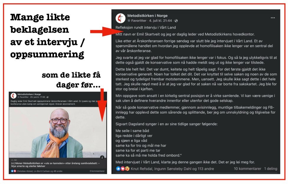 Ellers er SoMe en forunderlig arena. Få dager etter at Metodistkirken 29. juni fikk mange «likes» og hjerter på Facebook for henvisningen til Vårt Lands intervju med daglig leder Emil Skartveit, presterer en rekke av de samme personene å «like» beklagelsen Skartveit publiserte på kirkens Facebookside. En beklagelse hvor Skartveit la seg vesentlig flatere enn han hadde trengt å gjøre. Og absoluttMetodist hadde nok i sin naivitet trodd at en del av «likerne» av beklagelsen, heller ville stå fast og gitt Skartveit ryggdekning.